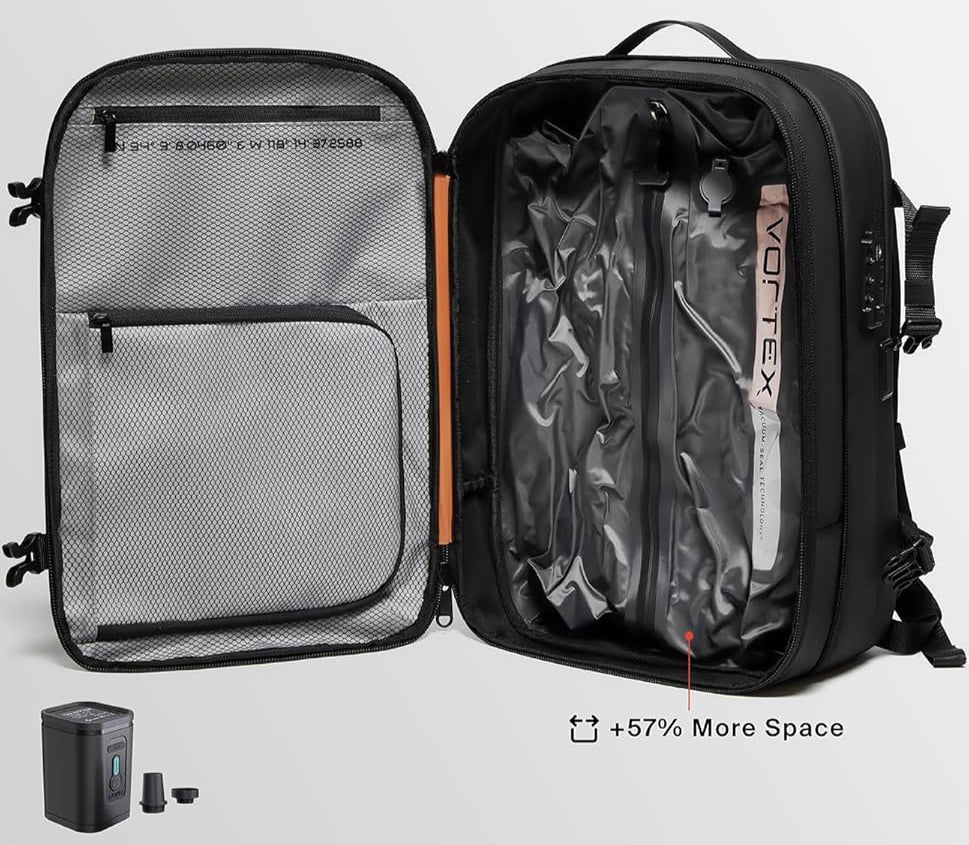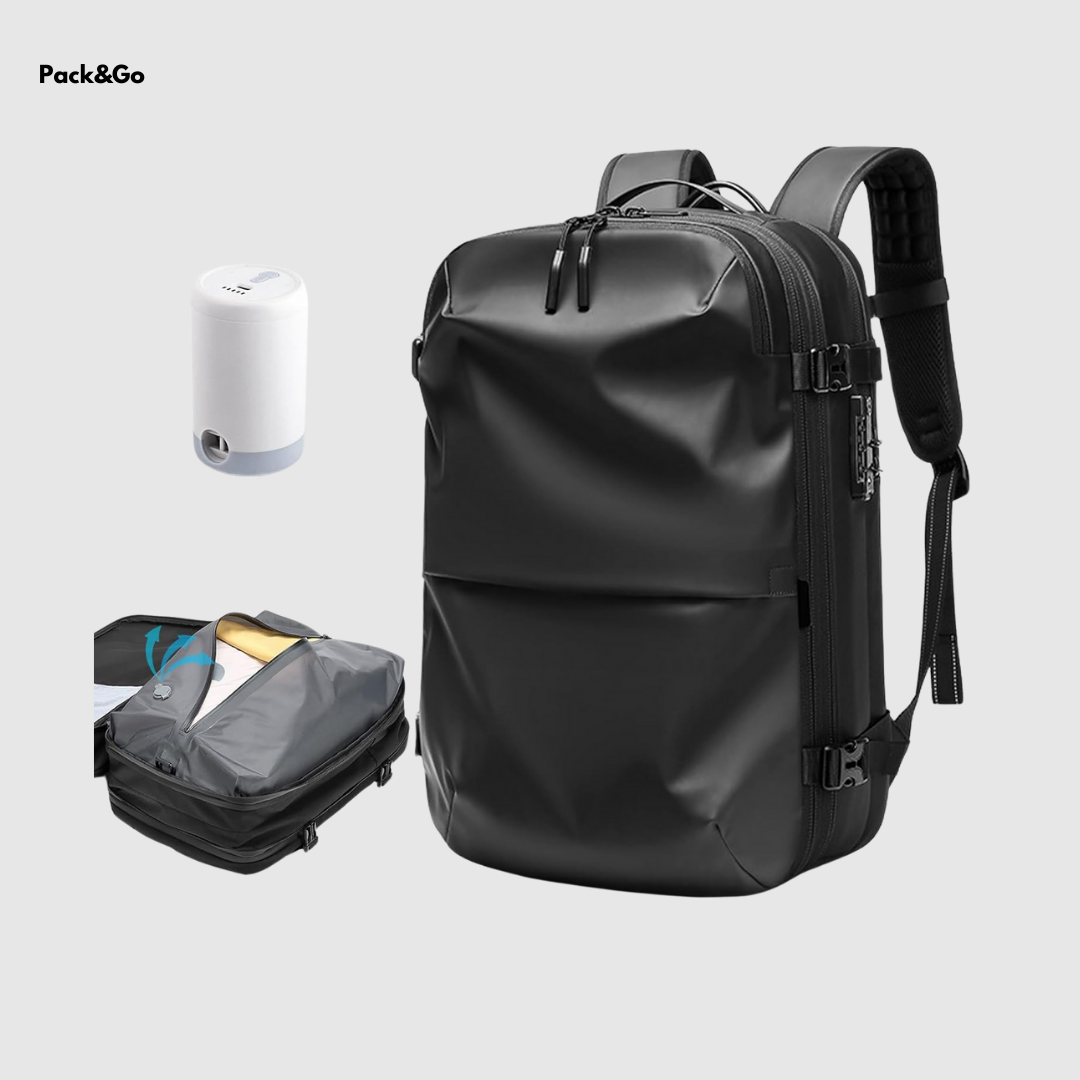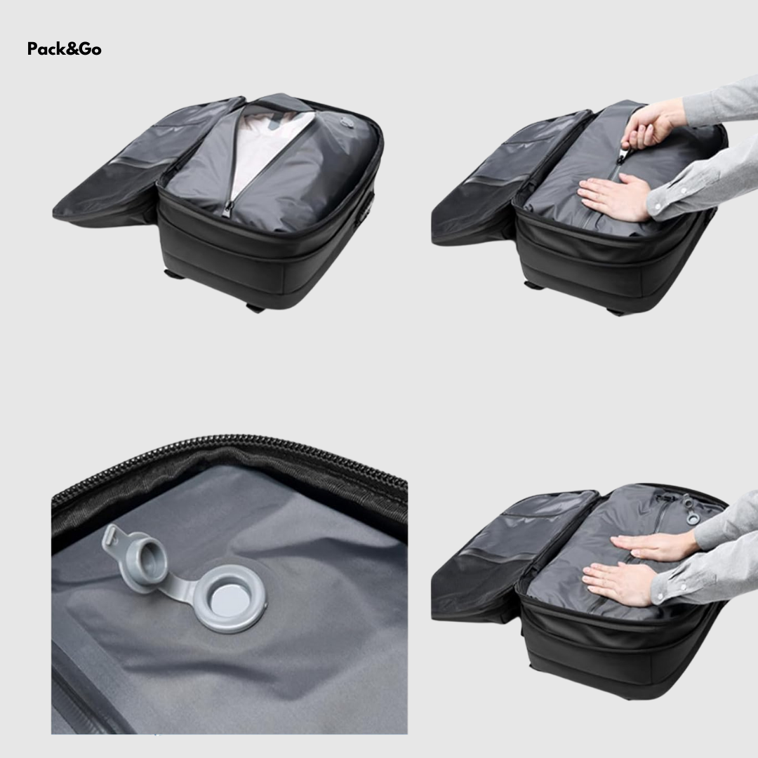 The backpack includes a built-in air valve. After packing your clothes, simply press down or roll the backpack to push air out through the valve—no vacuum or pump needed. This compresses the contents and saves space.
