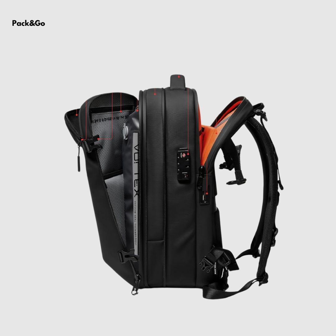 Say goodbye to bulky luggage. The AirVault Airback's built-in vacuum seal technology compresses your belongings, freeing up to 50% more space in your backpack. Perfect for travelers aiming to pack light without leaving essentials behind.